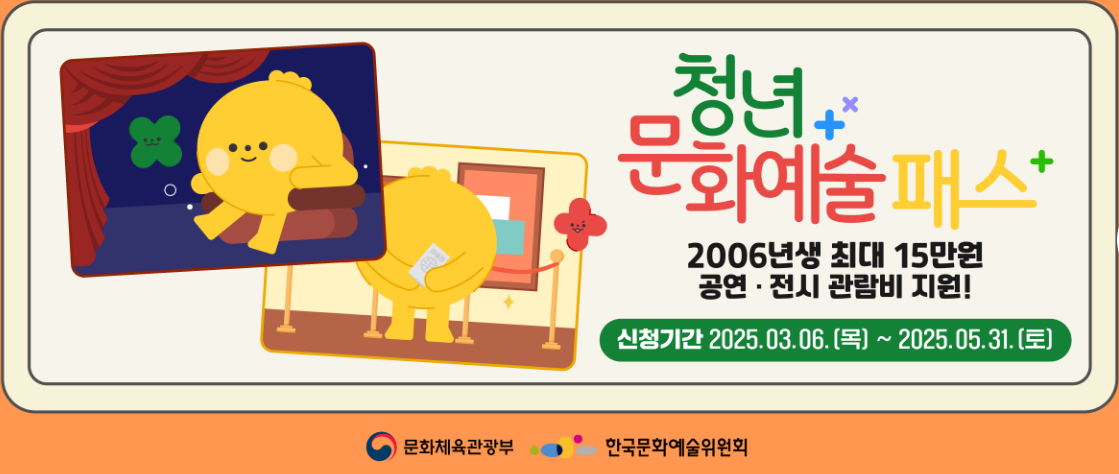 - 신청 방법: 협력 예매처(인터파크, YES24) 회원가입 및 본인인증 후, 청년문화예술패스 누리집에서 신청